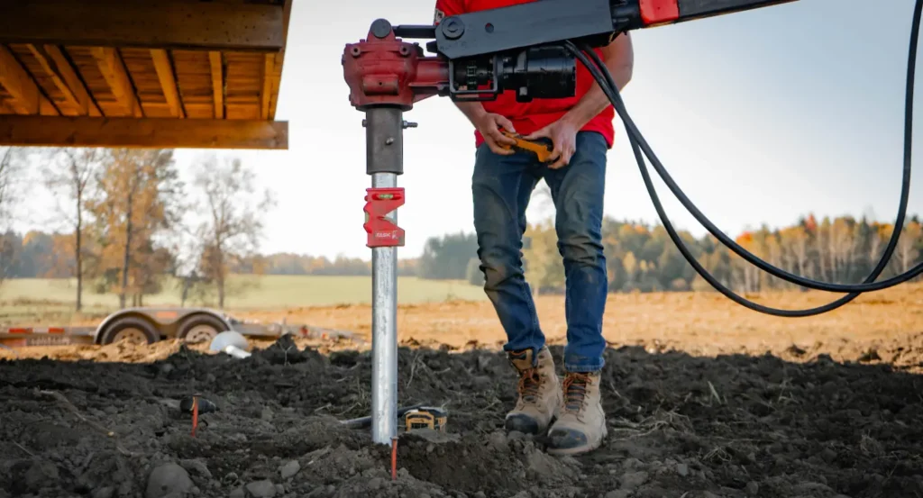 Une fois les trous creusés viennent le temps alors d’installer les pieux. Il est assez commun d’utiliser une tarière qui possède un adaptateur qui permet la connexion du pieu vissé sur l’appareil. Ainsi, l’outil peut être utilisé pour la pose du pieu.