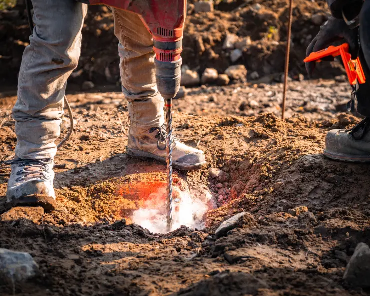 Vient ensuite l’utilisation de la tarière, ou vrille de charpentier. La tarière est un outil à mèche en forme d’hélicoptère. Cette dernière peut être motorisée ou manuelle. Avec un système de rotation, soutenue par une pression continue, la machine perce le sol afin de créer un espace vacant pour le pieu vissé.